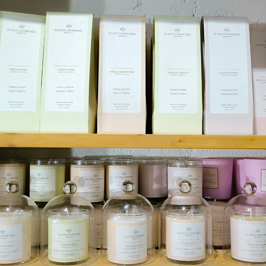- Parfums d’intérieur, bougies cire végétale, gamme de crème et soin au lait d’ânesse, savons de la Maison Plantes et Parfum de Grasse